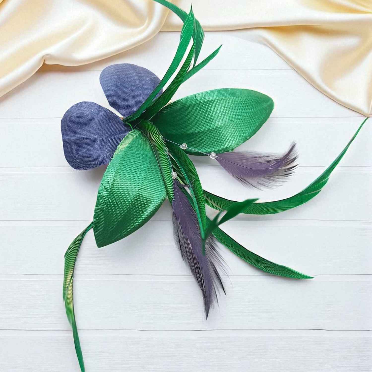 - Flor de tela en color azul marino con detalle de plumas.